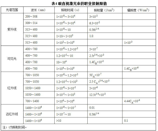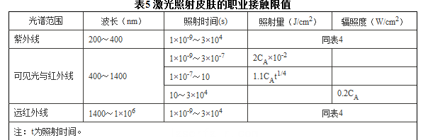 7.2.2 8h激光照射皮膚的職業(ye) 接觸限值(見表5)