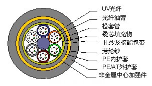 光纜結構是完全非金屬的, 中心加強件是FRP(玻璃纖維增強塑料) ,在上麵絞合鬆套管或填充繩。整個(ge) 纜芯填滿了阻水油膏並繞包非吸濕性包帶。纜芯上麵擠製聚乙烯內(nei) 護套, 繞包雙層芳綸絲(si) , 以確保結構無扭轉現象。最後擠外護套, 采用常規的聚乙烯或一種特殊的能承受高電場的耐電痕聚乙烯。