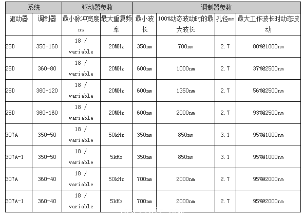 係統 驅動器參數 調製器參數 驅動器 調製器 最小脈衝(chong) 寬度ns 最大重複頻率 最小波長 100%動態波動時的最大波長 孔徑mm 最大工作波長時動態波動 25D 350-160 18 / variable 20MHz 350nm 700nm 2.7 80%@1000nm 25D 360-80 18 / variable 20MHz 600nm 1000nm 2.7 37%@2500nm 25D 360-120 18 / variable 20MHz 600nm 1350nm 2.7 56%@2500nm 25D 360-160 18 / variable 20MHz 600nm 2000nm 2.7 93%@2500nm 307A 350-50 18 / variable 50kHz 350nm 850nm 3.1 95%@1000nm 307A-1 350-50 18 / variable 5kHz 350nm 850nm 3.1 95%@1000nm 307A 360-40 18 / variable 50kHz 700nm 2000nm 2.7 95%@2000nm 307A-1 360-40 18 / variable 5kHz 700nm 2000nm 2.7 95%@2000nm 係統 驅動器參數 調製器參數 驅動器 調製器 最小脈衝(chong) 寬度ns 最大重複頻率 最小波長 100%動態波動時的最大波長 孔徑mm 最大工作波長時動態波動 25D 350-160 18 / variable 20MHz 350nm 700nm 2.7 80%@1000nm 25D 360-80 18 / variable 20MHz 600nm 1000nm 2.7 37%@2500nm 25D 360-120 18 / variable 20MHz 600nm 1350nm 2.7 56%@2500nm 25D 360-160 18 / variable 20MHz 600nm 2000nm 2.7 93%@2500nm 307A 350-50 18 / variable 50kHz 350nm 850nm 3.1 95%@1000nm 307A-1 350-50 18 / variable 5kHz 350nm 850nm 3.1 95%@1000nm 307A 360-40 18 / variable 50kHz 700nm 2000nm 2.7 95%@2000nm 307A-1 360-40 18 / variable 5kHz 700nm 2000nm 2.7 95%@2000nm 係統 驅動器參數 調製器參數 驅動器 調製器 最小脈衝(chong) 寬度ns 最大重複頻率 最小波長 100%動態波動時的最大波長 孔徑mm 最大工作波長時動態波動 25D 350-160 18 / variable 20MHz 350nm 700nm 2.7 80%@1000nm 25D 360-80 18 / variable 20MHz 600nm 1000nm 2.7 37%@2500nm 25D 360-120 18 / variable 20MHz 600nm 1350nm 2.7 56%@2500nm 25D 360-160 18 / variable 20MHz 600nm 2000nm 2.7 93%@2500nm 307A 350-50 18 / variable 50kHz 350nm 850nm 3.1 95%@1000nm 307A-1 350-50 18 / variable 5kHz 350nm 850nm 3.1 95%@1000nm 307A 360-40 18 / variable 50kHz 700nm 2000nm 2.7 95%@2000nm 307A-1 360-40 18 / variable 5kHz 700nm 2000nm 2.7 95%@2000nm