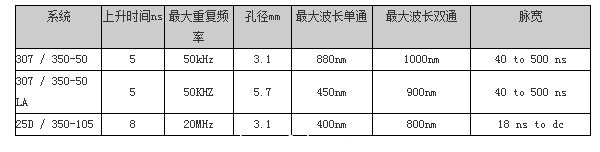 係統 上升時間ns 最大重複頻率 孔徑mm 最大波長單通 最大波長雙通 脈寬 307 / 350-50 5 50kHz 3.1 880nm 1000nm 40 to 500 ns 307 / 350-50 LA 5 50KHZ 5.7 450nm 900nm 40 to 500 ns 25D / 350-105 8 20MHz 3.1 400nm 800nm 18 ns to dc