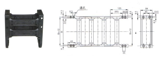 特點:耐磨、耐高溫、不變形、低噪音、裝拆靈活、壽命特長。 TP62係列 型號 內(nei) 腔(高X寬) 外腔(高X寬) 彎曲半徑(R) 節距 不支撐長度(M) 型式 62.75 62x75 83x112...