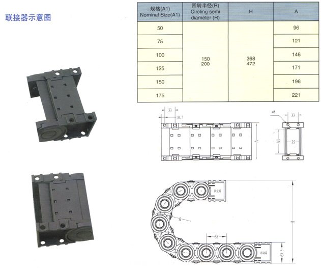 型號 內(nei) 腔(高X寬) 外腔(高X寬) 彎曲半徑(R) 節距 不支撐長度(M) 型式 45.50 45x50 79x96 150.200 78 10 上下蓋均可開,滾輪橋式、滾輪全封閉 45.75 45x75 79x12...