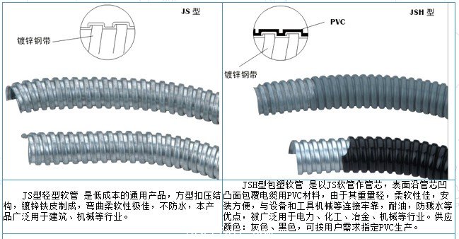 JS型輕型軟管 是低成本的通用產(chan) 品,方型扣壓結構,鍍鋅鐵皮製成,彎曲柔軟性極佳,不防水,本產(chan) 品廣泛用於(yu) 建築、機械等行業(ye) 。 JSH型包塑軟管 是以JS軟管作管芯,表麵沿...