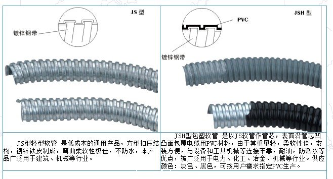 JS型輕型軟管JSH型包塑軟管 JS型輕型軟管 是低成本的通用產(chan) 品,方型扣壓結構,鍍鋅鐵皮製成,彎曲柔軟性極佳,不防水,本產(chan) 品廣泛用於(yu) 建築、機械等行業(ye) 。 JSH型包塑軟管...