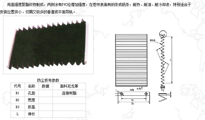 風琴式防塵折布 用高強度聚脂織物製成,兩(liang) 側(ce) 塗有PVC經增加強度,在卷簾表麵有鋼條或鋁條,耐熱、耐油、耐冷卻液,特別適合於(yu) 安裝位置狹小、切屑又較多的垂直或平麵導軌...