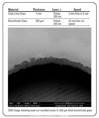 對於(yu) 100μm厚的Shott D-263玻璃,切割速度可高達到40mm/s。采用短脈衝(chong) 激光工藝使得玻璃薄片上麵在不微裂紋產(chan) 生的前提下,切割較為(wei) 尖銳的角度成為(wei) 了現實。