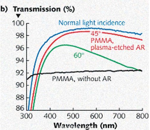 圖4:對聚合物材料如有機玻璃(PMMA)進行直接等離子體(ti) 刻蝕,創建出亞(ya) 微米級的表麵結構(a),以此作為(wei) 防反射膜(b)。