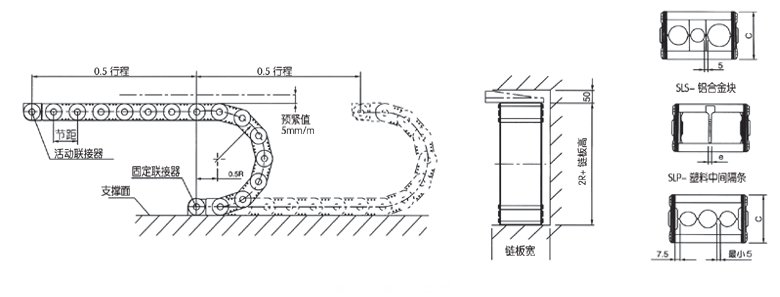 拖鏈的長度=1/2行程+4個(ge) 彎曲半徑, 這隻適用於(yu) 當固定聯結是在行程的中點時.
