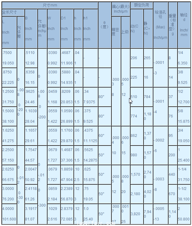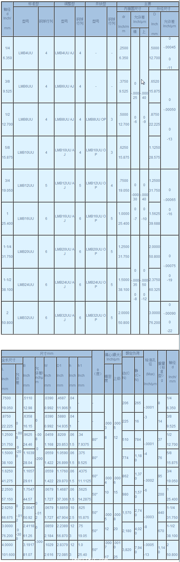 LMB英製係列 LMB英製直線軸承係列 軸徑 d Inch/ mm 標準型 調整型 開放型 主要 型號 鋼球行列 型號 鋼球行列 型號 鋼球行列 內(nei) 接圓尺寸 外徑尺寸 dr Inch/mm 允許差 Inc...