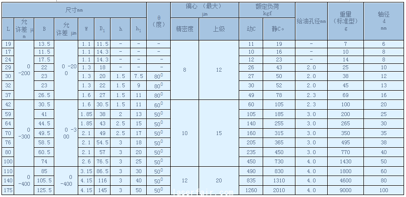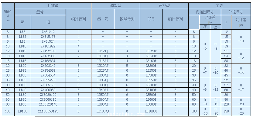 LB直線軸承係列 LB直線軸承通用係列 軸徑 d mm 標準型 調整型 開放型 主要 型號 鋼球行列 型 號 鋼球行列 形號 鋼球行列 內(nei) 接圓尺寸 外徑尺寸 新 舊 允許差 m D 允許差 ...