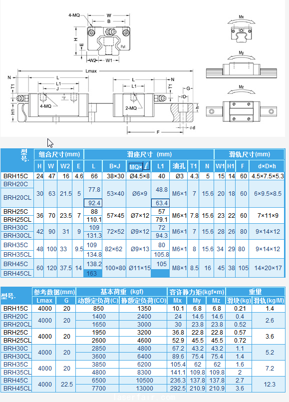 型號 . 組合尺寸 (mm) 滑座尺寸 (mm) 滑軌尺寸 (mm) H W W2 E L BJ MQ L1 油孔 T1 N W1 H1 F dDh BRH15C 24 47 16 4.6 66 3830 4.58 40 3 4.3 5 15 14 60 4.57.55.3 BRH...