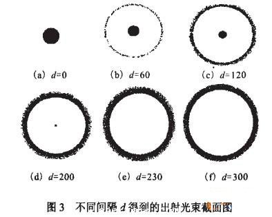 時,出射光束為(wei) 環狀斜光束。圖3為(wei) 不同間隔d得到的出射光束狀態截麵圖。可以看出,當d=0mm時,光束為(wei) 實心光束,隨著d的增大,中心實心光束越來越小,同時在實現光束外麵出現環狀光束,並且環的寬度和環內(nei) 徑隨之增大。當d=230mm時,出射光束中心出現暗中空區域,形成環狀光束,與(yu) 理論分析隋況一致。在無衍射區域內(nei) ,入射光束經旋轉棱鏡組合係統後的變換光束基本沒有發生能量損耗,實心光束和環光束總能量與(yu) 入射光束能量等同。