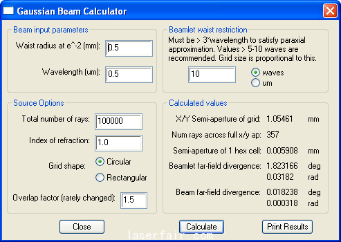 Gaussian beam calculator dialog