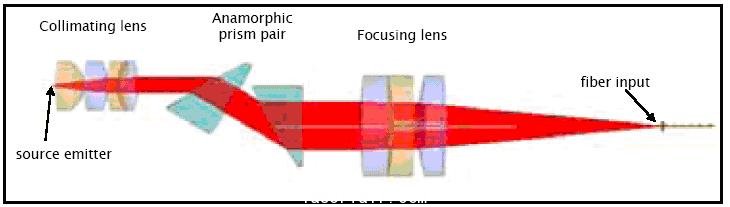 Key Words: laser diode, fiber coupling, collimating lens, coherent rays, Gaussian beam, wavelengths, far-field distribution, astigmatism, wedge prisms, focal length, irradiance, flux distribution, optimization