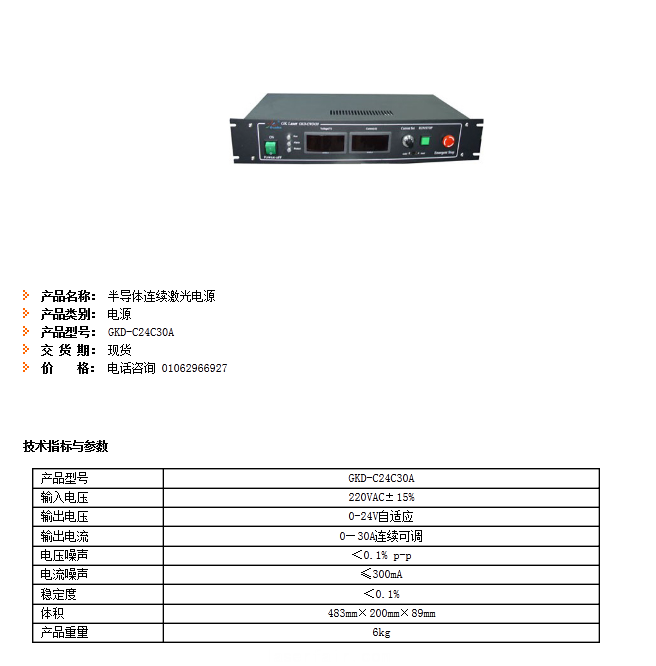 產(chan) 品名稱: 半導體(ti) 連續激光電源 產(chan) 品類別: 電源 產(chan) 品型號: GKD-C24C30A 交 貨 期: 現貨 價(jia) 格: 電話谘詢 01062966927 技術指標與(yu) 參數 產(chan) 品型號 GKD-C24C30A 輸入電...