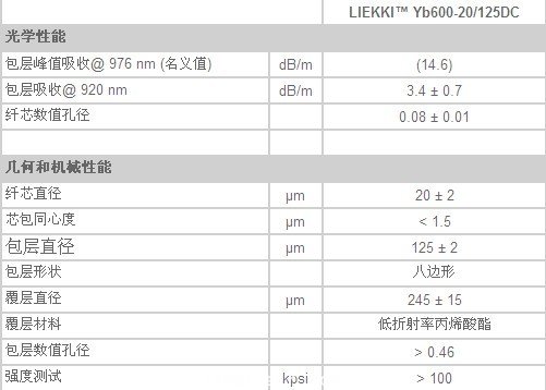 LIEKKI™ Yb600-20/125光纖目前隻提供雙包層(Yb600-20/125DC)。