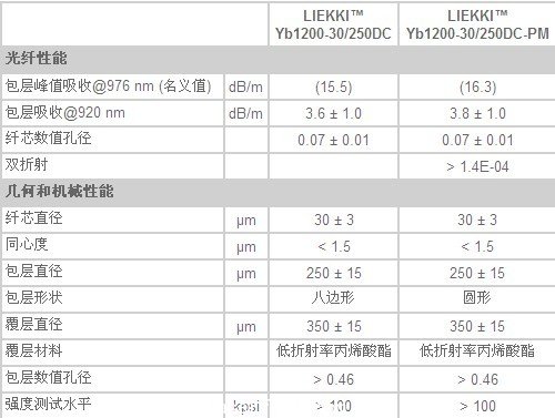 LIEKKI™ Yb1200-30/250 光纖包括雙包層 (Yb1200-30/250DC) 和雙包層保偏 (Yb1200-30/250DC-PM) 光纖。