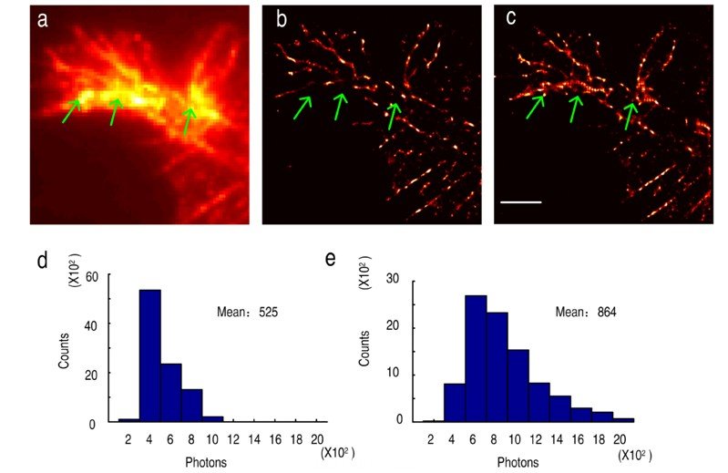 (a)TIRF圖像;(b)由稀疏定位方法得到超分辨圖像;(c)由SSM_BIC方法分析得到的超分辨圖像;(d)-(e)單分子的信息統計。(標尺: 2 μm )。