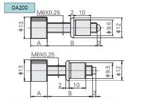 產(chan) 品類型:OA200/210係列微調螺紋副 主要特征: ●M6×0.25細牙微調螺紋副; ●可與(yu) 微分頭互換。 ●帶鎖緊微調螺紋副型號後加後綴-L。 技術指標: ●螺距:0.25mm ●分辨率:0.002mm 技術參數: 型號 行程 A B 備注 OA201 6 10 20 圓端 OA211 6 10 20 平端 OA202 13 10 27 圓端 OA212 13 10 27 平端 OA203 25 20 39 圓端 OA213 25 20 39 平端 OA204 50 20 64 圓端 OA214 50 20 64 平端