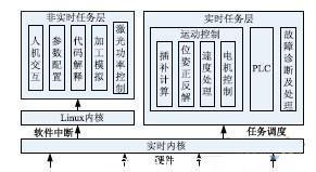 並聯機器人數控係統是一個(ge) 實時多任務軟件係統,它可以分為(wei) 實時任務層和非實時任務層兩(liang) 層.實時任務層包括插補計算模塊、位姿正反解模塊、速度處理模塊、電機控製模塊、軟PLC模塊、故障診斷及處理模塊等直接與(yu) 數控加工相關(guan) 的、對實時性要求較高的功能模塊,此層由RTLinux 實時子係統來處理;除此之外,對實時性要求不高的功能模塊,如人機交互模塊、參數配置模塊、代碼解釋模塊、加工模擬模塊、文件管理模塊等,為(wei) 非實時任務層,由普通Linux內(nei) 核控製,數控係統軟件功能結構如圖1所示.這樣分層的好處是使實時任務和非實時任務運行在不同的進程空間,便於(yu) 保證係統的實時性,係統層次分明,增強了開放性和靈活性,可以適應多種實際應用.