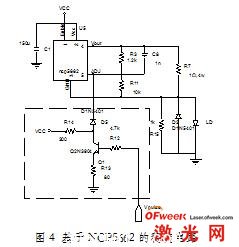 脈衝(chong) 控製電路如圖4虛框所示,當脈衝(chong) 控製信號Vpulse為(wei) 低電平時,三極管Q1 截止,其集電極被電源電壓控製在高電平,二極管D5正向導通,因此NCP5662的ADJ端被強製在高電平,這個(ge) 電平值必須高於(yu) 恒定電流流過負載時ADJ端的電平值,讓R11兩(liang) 端電壓遠遠高於(yu) 0.9伏,使得NCP5662內(nei) 部的功率晶體(ti) 管截止,從(cong) 而使流過LD的電流近似為(wei) 零。因此,與(yu) 激光二極管並聯的1K電阻R11的作用是防止截止狀態時激光二極管出現的高阻特性讓ADJ端的電平出現不穩定,當負載呈現一般的電阻特性時,R11可以不要。當Vpulse跳向高電平時,晶體(ti) 管Q1的集電極電位轉向低電平,從(cong) 而瞬間讓ADJ端電位很低,使得R11兩(liang) 端電壓遠低於(yu) 0.9伏,從(cong) 而使NCP5662內(nei) 部的功率晶體(ti) 管導通, ADJ的電位開始上升,最後進入穩定工作階段, 恒定電流流過激光二極管。二極管D5也進入反偏狀態,起隔離作用,直到下一個(ge) 低電平Vpulse控製信號的到來,如此反複,實現了大電流的快速開關(guan) ,這主要得益於(yu) NCP5662的快速響應特性,其本質是因為(wei) 其內(nei) 部集成了高速放大器及高速功率放大晶體(ti) 管。