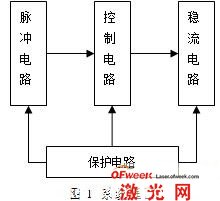 該半導體(ti) 激光器驅動電源由脈衝(chong) 電路、控製電路、穩流電路和保護電路的四部分組成,係統框圖如圖1所示。