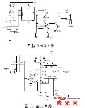 5a為(wei) 該電源內(nei) 部振蕩電路,由7555構成,四個(ge) 與(yu) 非門的作用是選通接受內(nei) 部控製信號還是外部控製信號輸出到Vtrigger,Vtrigger 信號控製所需要的Vtrigger信號的頻率。圖5b是一個(ge) 由555定時器構成的下降沿觸發的單穩電路。該單穩電路的特點是脈衝(chong) 寬度與(yu) 7555定時器5端的電壓成非常好的線形關(guan) 係,這主要得益於(yu) 應用了由放大器LM358和電容C6構成的自舉(ju) 電路[6],因此,這就實現了獨立控製脈衝(chong) 恒流源脈衝(chong) 頻率和脈衝(chong) 寬度的功能,脈衝(chong) 寬度能接受外部電壓信號的控製,如來自溫度傳(chuan) 感器熱敏電阻上的電壓信號。#p#分頁標題#e#