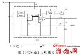 考慮到實際應用情況,如電源體(ti) 積、輸出電流大小、特別是瞬態響應,我們(men) 選用ONSEMI公司的低壓差大電流集成可調穩壓芯片NCP5662,它的瞬態響應比同類穩壓器要快,建立時間1-3us,可承受電流值達2A,具有內(nei) 部電流限製和熱保護功能等,其功能框圖如圖3所示。圖3顯示的是其穩壓工作的情況,根據前麵敘述的原理,對該集成電路進行擴展以將其設計成為(wei) 一個(ge) 穩定度很高的恒流源,幾種擴展方法中,實驗證明比較合理的工作方式如圖4所示。先不考慮圖中虛框內(nei) 的電路,當加電之後,電路開始工作,進入穩態時,由於(yu) 集成電路內(nei) 部的反饋作用,R11兩(liang) 端的電壓始終保持在0.9V,所以,R7兩(liang) 端的電壓始保持在 ,故流過R7兩(liang) 端的電流Is由下式確定: