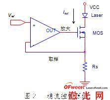 在穩壓或穩流電源中,目前常用的是開關(guan) 電源和線性電源,由於(yu) 開關(guan) 電源的瞬態響應較差、紋波係數較大[2],對瞬態特性和溫度度要求較高的半導體(ti) 激光驅動電源采用線性電源較為(wei) 合理。為(wei) 了實現高的電流穩定度,驅動電路大多采用負反饋的控製方法,原理圖見圖2。工作時,通過電阻電流采樣反饋為(wei) 驅動電流提供有源控製。方法是在功率晶體(ti) 管的源極串聯一個(ge) 采樣電阻RS,用於(yu) 取樣反饋,該取樣電壓經過I/U轉後,作為(wei) 反饋電壓與(yu) 設定電壓進行比較,進而通過調整功率晶體(ti) 管的電阻大小對輸出電流If進行調整。整個(ge) 閉環反饋係統處於(yu) 動態平衡中,以達到穩定電流的目的。輸出電流If與(yu) 設定的參考電壓Vref的關(guan) 係可由負反饋原理得到 ,上式隻是一個(ge) 近似的表達,隨著負載的不同和輸入電壓的變化,輸出電流還是有微小的變化,但是由於(yu) 前置放大器放大倍數很高,使得輸出電流變化很小,穩定度一般能達到10-5量級。