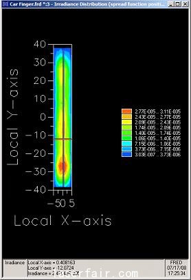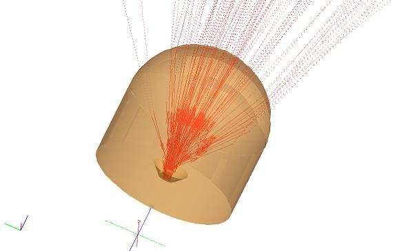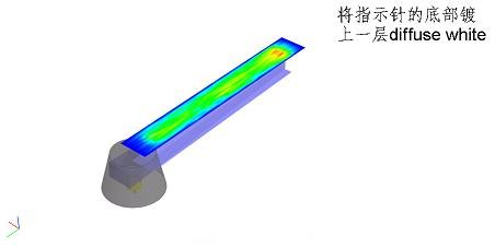步驟一) 首先, 從(cong) FRED光源庫中選取一顆LED作為(wei) 光源。 步驟二) 導入由CAD軟件設計的指針文件,並將指針和蓋子的材料特性賦予成PMMA 。 步驟三 追跡由LED發出的10000條光...