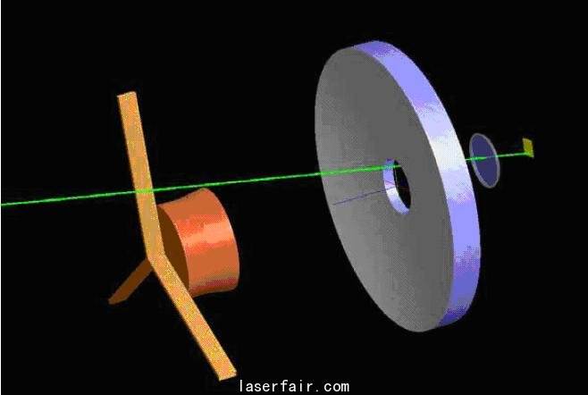 圖2— 圖中所示綠色光線是軸外光源發出的光線,該光線繞開所有的光學部件並且直接進入探測器上。FRED 的3D可視化效果和用戶自定義(yi) 光路的能力,使得這個(ge) 問題很容易被發現。