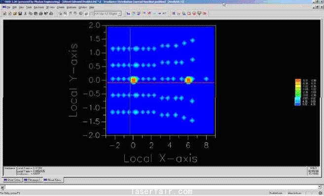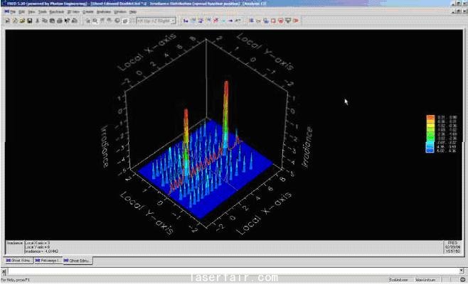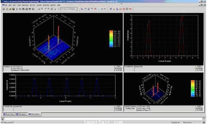 FRED 以四色的麵板呈現輻照度圖。左上方是一個(ge) 等大的偽(wei) 彩色圖,它顯示的是在選中分析麵上單元功率。 右邊的刻度顯示的是這個(ge) 圖中的功率等級。 右上和左下的麵板是左上麵板的橫截麵。點擊左上方圖中的任一處,一個(ge) 橫截麵將會(hui) 出現在水平以及垂直兩(liang) 個(ge) 方向,在這個(ge) 位置的坐標和輻射將會(hui) 顯示在這個(ge) 左上方的麵板的左下角。右下方的圖顯示在這個(ge) 分析麵上定義(yi) 的各個(ge) 像素的數量和光線。如果用戶點擊右下方的圖,就可以看到每個(ge) 探測器像素的相對誤差。這是一個(ge) 很好的方式讓你知道是否已經追跡了足夠多的光線來為(wei) 係統繪製有效的輻照度圖, 這點對於(yu) 照明係統來說尤其重要。兩(liang) 個(ge) 雙膠合透鏡係統的輻照圖在下圖9中顯示。