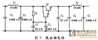 半導體(ti) 激光器往往會(hui) 因為(wei) 接在同一電網上的多種電器的突然開啟或者關(guan) 閉而受到損壞,這主要是由於(yu) 開關(guan) 的閉合和開啟的瞬間會(hui) 產(chan) 生一個(ge) 很大的衝(chong) 擊電流,就是該電流致使半導體(ti) 激光器損壞,介於(yu) 這種情況,必須加以克服。因此,驅動電源的輸入應該設計成慢啟動電路,以防損壞,如圖2所示:左邊輸入端接穩壓後的直流電壓,右邊為(wei) 輸出端。整個(ge) 電路的結構可看作是在射級輸出器上添加了兩(liang) 個(ge) Ⅱ型濾波網絡,分別由L1,C1,C2和L2,C6,C7組成。電容C5構成的C型濾波網絡及一個(ge) 時間延遲網絡。慢啟動輸入電壓V在開關(guan) 和閉合的瞬間產(chan) 生大量的高頻成分,經過圖中的兩(liang) 個(ge) Ⅱ型網絡濾出大部分的高頻分量,直流以及低頻分量則可以順利地經過。到達電阻R和C組成的時間延遲網絡,C2和C4並聯是為(wei) 了減少電解電容對高頻分量的電感效應。