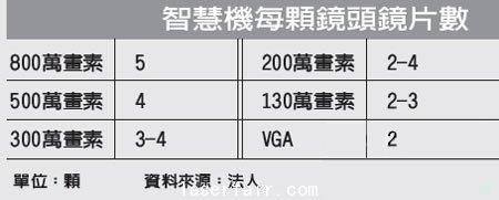 市場統計,去年大立光與(yu) 玉晶光兩(liang) 家全球市占率28.5%,若加計新钜科、今國光、亞(ya) 光、先進光等光學六雄砸重金擴產(chan) 後,今年台灣光學鏡頭業(ye) 在全球市占率估達40%,成為(wei) 台灣之光。由於(yu) iphoness點火,引爆全球鏡頭的需求,近幾年在智能手機及低價(jia) 計算機熱賣下,帶動照相手機鏡頭及筆記型計算機(NB)模塊出貨大幅成長,隨著手機照相功能成為(wei) 必備功能,3G手機、高階智能手機對內(nei) 建相機質量逐漸提高,手機相機主流規格今年躍升至500萬(wan) 畫素,照相手機成為(wei) 驅動光學元件廠業(ye) 績爆發的最大動能。