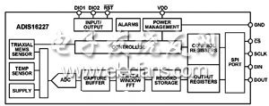 圖2 ADIS16227具備檢測和分析功能,可簡化設計,左側(ce) 為(wei) 功能框圖