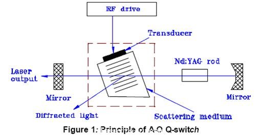 如果激光光學諧振腔的建成是相對於(yu) 0維衍射光(非衍射光), 當射頻信號被感知,衍射光便從(cong) 激光光學諧振腔軸線產(chan) 生. 結果,激光光學諧振腔內(nei) 發生損失,及激光振蕩受到打壓. 利用這一現象, 射頻信號隻在特定某個(ge) 時間長度內(nei) 被感知,(地位低Q值)來暫停激光振蕩. 在此期間,反轉的Nd:YAG激光棒通過連續泵浦積累了很多. 當射頻信號減至零(地位高Q值)和激光光學諧振腔內(nei) 的損失消除了, 累積的能量以在極短的時間長度內(nei) 脈衝(chong) 形式的激光振蕩被激活,. 他們(men) 是Q開關(guan) 脈衝(chong) .