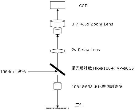 激光1064nm通過兩(liang) 麵拋光的反射鏡折射到下部,經過聚焦作用在工件上。可見光通過反射鏡透射到上部,經過relay透鏡將工件聚焦,經過一個(ge) CCD的可調物鏡將工件成像在CCD的焦麵上。