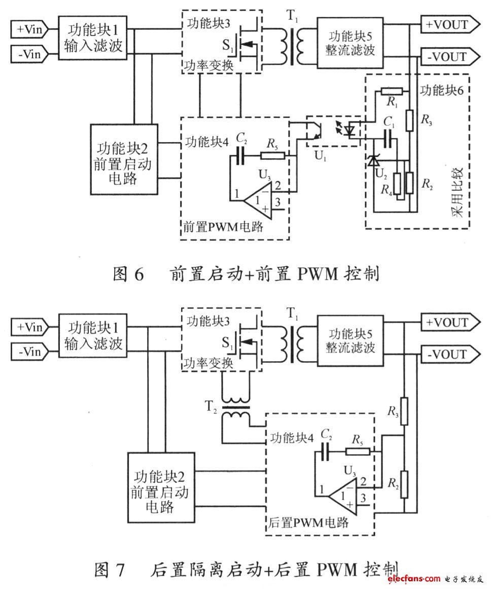 無論是國外還是國內(nei) DC/DC電源線路的設計,就隔離方式來講都可歸結為(wei) 兩(liang) 種最基本的形式:前置啟動+前置PWM控製和後置隔離啟動+後置PWM控製。具體(ti) 結構框圖如圖6和圖7所示。