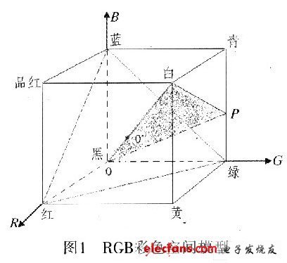 圖1所示是一個(ge) RGB彩色空間的立方體(ti) 模型,邊長歸一化為(wei) 1,原點處為(wei) 黑色,相對的頂點處為(wei) 白色。連接黑白兩(liang) 點得到灰度軸,這根軸上的飽和度為(wei) 0,即沒有彩色分量。在灰度軸上有相同投影點的點具有相同的亮度,即垂直於(yu) 灰度軸的平麵內(nei) 的點具有相同的亮度值。