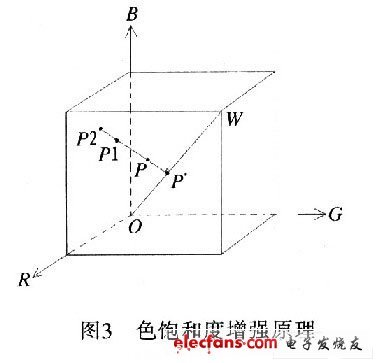 HSI模型可以方便地對色調和飽和度進行調整,但是其運算比較複雜,很難用硬件來實現。不過根據其原理,可以直接在RGB空間進行色飽和度的調整。這裏假設RGB立方體(ti) 內(nei) 任一點P(r,g,b),容易求出其在灰度軸上的投影點P*