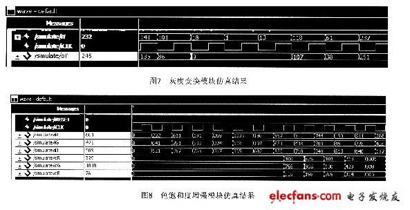 用ModelSim對灰度變換模塊進行仿真的結果,如圖7所示。對色飽和度增強模塊進行仿真的結果,如圖8所示。
