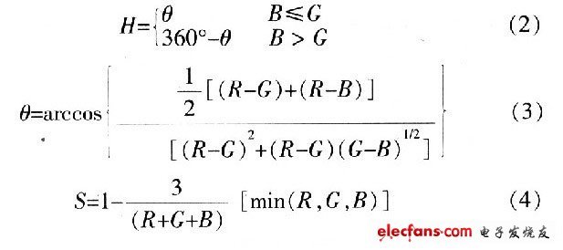 由圖2看出,三原色是按120°分割的,青、品紅和黃被稱為(wei) 二次色,也是按120°分割,一次色與(yu) 二次色之間相隔60°。圖中任給出一點Q,若以紅軸作參考,則Q向量與(yu) 紅軸的夾角H決(jue) 定其色調,而向量長度S決(jue) 定其飽和度,整個(ge) 平麵在灰度軸上的位置決(jue) 定了平麵內(nei) 所有點的亮度I。於(yu) 是得到由RGB到HSI的轉換關(guan) 係: