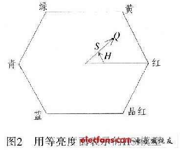 實際上,用垂直於(yu) 灰度軸的平麵內(nei) 的彩色點軌跡來表示HSI空間(等亮度麵)。當平麵沿灰度軸上下移動時,由於(yu) 立方體(ti) 邊界的切割而構成的橫截麵所決(jue) 定的邊界呈三角形或呈六邊形。這裏以六邊形為(wei) 例,如圖2所示。