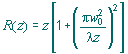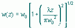 這裏的z是當波陣麵平坦時從(cong) 平麵上的傳(chuan) 播路徑,l是光的波長,w是當波陣麵平坦時,在平麵上1/e2發光輪廓的半徑,w(z)是在波傳(chuan) 播了距離z以後,1/e2輪廓的半徑,R(z)是在波傳(chuan) 播了距離z以後,波陣麵的曲率半徑。在z=0的條件下,R(z)是無窮大的,在某種有限的z的最小值內(nei) 傳(chuan) 播,並且當z進一步增大的時候,趨近於(yu) 無窮大。Z=0平麵標記了高斯腰的位置,或者表示波陣麵是平坦的地方,這裏w0叫做光束腰半徑。