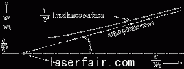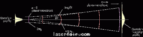 即使一個(ge) 高斯TEM(橫模和縱模為(wei) 0)激光光束波陣麵在某個(ge) 平麵可以保持非常的平坦,它也需要彎曲並且通過如下的公式傳(chuan) 播