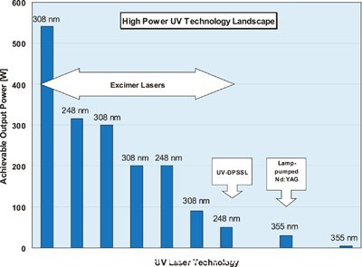 圖3. 各種高功率準分子激光器的輸出功率水平與(yu) 基於(yu) 全固態的355nm激光技術比較,圖中給出了308nm和248nm波長的準分子激光情況。