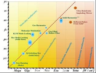 隨著激光技術飛速發展,超快激光出現了人們(men) 的視線之中,它具備獨特的超短脈衝(chong) 、超強特性,能以較低的脈衝(chong) 能量獲得極高的峰值光強。超短脈衝(chong) 啁啾放大技術(Chirped Pulse Amplification,CPA)的出現使超快激光的強度得到大大提高。與(yu) 傳(chuan) 統長脈衝(chong) 激光及連續激光不同,超快激光有著超短的激光脈衝(chong) ,這使得激光脈衝(chong) 的頻譜寬度相當大。這樣寬的頻譜在進行諸如原子能級研究,激光選鍵化學等方麵都具有重要的應用。利用超快激光脈衝(chong) 短的特點,可以采用泵浦-探測的方式,將激光脈衝(chong) 與(yu) 物質相互作用現象在不同的時刻照相,以期獲得整個(ge) 過程的特點。這個(ge) 方法已經被應用到各個(ge) 領域,如在原子與(yu) 分子反應動力學研究中以及觀察電子的運動,利用飛秒激光脈衝(chong) 甚至阿秒脈衝(chong) ,通過泵浦-探測的方法觀察到反應過程。聚焦後的超快激光,其峰值功率密度超過1013W/cm2時,所產(chan) 生的電場強度就已經大於(yu) 原子的內(nei) 電場。它提供的極強極高的電場,能夠超過價(jia) 帶電子的束縛力,使分子、原子的電子體(ti) 係發生巨大變化。利用這個(ge) 特性,人們(men) 可以研究由於(yu) 超快激光導致原子內(nei) 部產(chan) 生的奇特現象。並且,超快激光還顯示出其它不同的特性,如熱影響區域小、作用效果能夠超過光學衍射極限、優(you) 秀的空間選擇特性。下圖展示了超快超強激光的發展過程與(yu) 應用範圍。