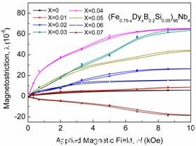 圖1:該非晶合金係外加磁場與(yu) 磁致伸縮關(guan) 係圖