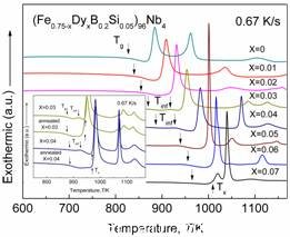 中科院寧波材料技術與(yu) 工程研究所沈寶龍課題組通過大量實驗研究,選擇合適的鐵基非晶合金體(ti) 係和適量的稀土元素摻雜,成功探索發現具有大非晶形成能力和高飽和磁致伸縮的鐵磁性塊體(ti) 非晶合金。該合金可製備出直徑為(wei) 4毫米的非晶合金棒材,其飽和磁致伸縮係數達到65×10-6(圖1),超過了任何已知鐵基非晶合金所具有的最大磁致伸縮值。此外,該鐵基塊體(ti) 非晶合金體(ti) 係具有100 K的大過冷液相區(圖2),因此可在該溫度區間內(nei) 像塑料一樣進行形狀複雜的超塑性加工。同時,該鐵磁性塊體(ti) 非晶合金體(ti) 係還具有0.65-0.86 T的飽和磁感應強度,超過7000的初始磁導率,以及3800-4000 MPa的超高強度。其優(you) 良的綜合性能使之有望成為(wei) 磁致伸縮傳(chuan) 感器芯體(ti) 材料。
