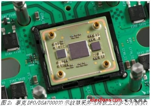 為(wei) 保證最高階測量級信號的完整性,從(cong) DPO/DSA70000D探頭接口輸入的電信號使用高性能電纜直接傳(chuan) 送到多芯片模塊(圖3)。通過利用這種前所未有的方式,隻有在采樣保持芯片捕獲測試信號後,測試信號才接觸示波器采集電路的PCB,從(cong) 而實現了100GS/s的采樣率和行業(ye) 領先的噪聲性能。